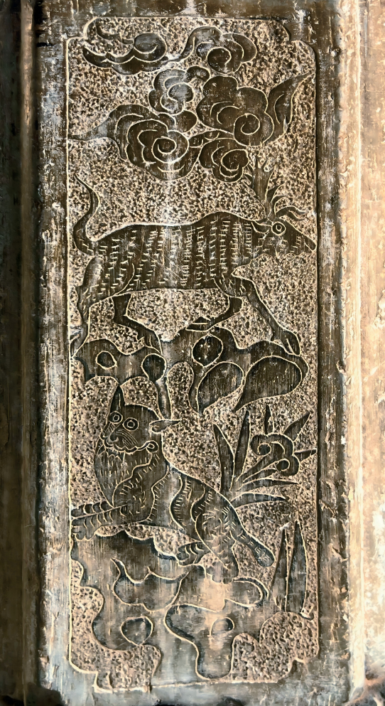 瑞兽呈祥 瑞兽类的建筑装饰题材,多以龙、凤凰、麒麟、狮子、鹿、鹤、马、牛、蝙蝠等为主要呈现内容,造型各异,寓意深远。以较为常见的凤凰和麒麟图案为例,石屏县芦子沟村的小高田19号民居的檐枋上,就采用浮雕和线雕法,展现了“丹凤衔书”的优美姿态;通海县马家巷沈家大院则在正房两侧的雀替上分别透雕“龙凤呈祥”的造型,寓意着吉祥与和谐;建水县团山村皇恩府正厅的檐枋上就浮雕有“麒麟吐玉书”图,象征着智慧与学识的传递;朱家花园花厅前的柱础石刻有老虎与鹿相伴的“福禄双全”图,一虎一鹿也有“文武双全”之意。