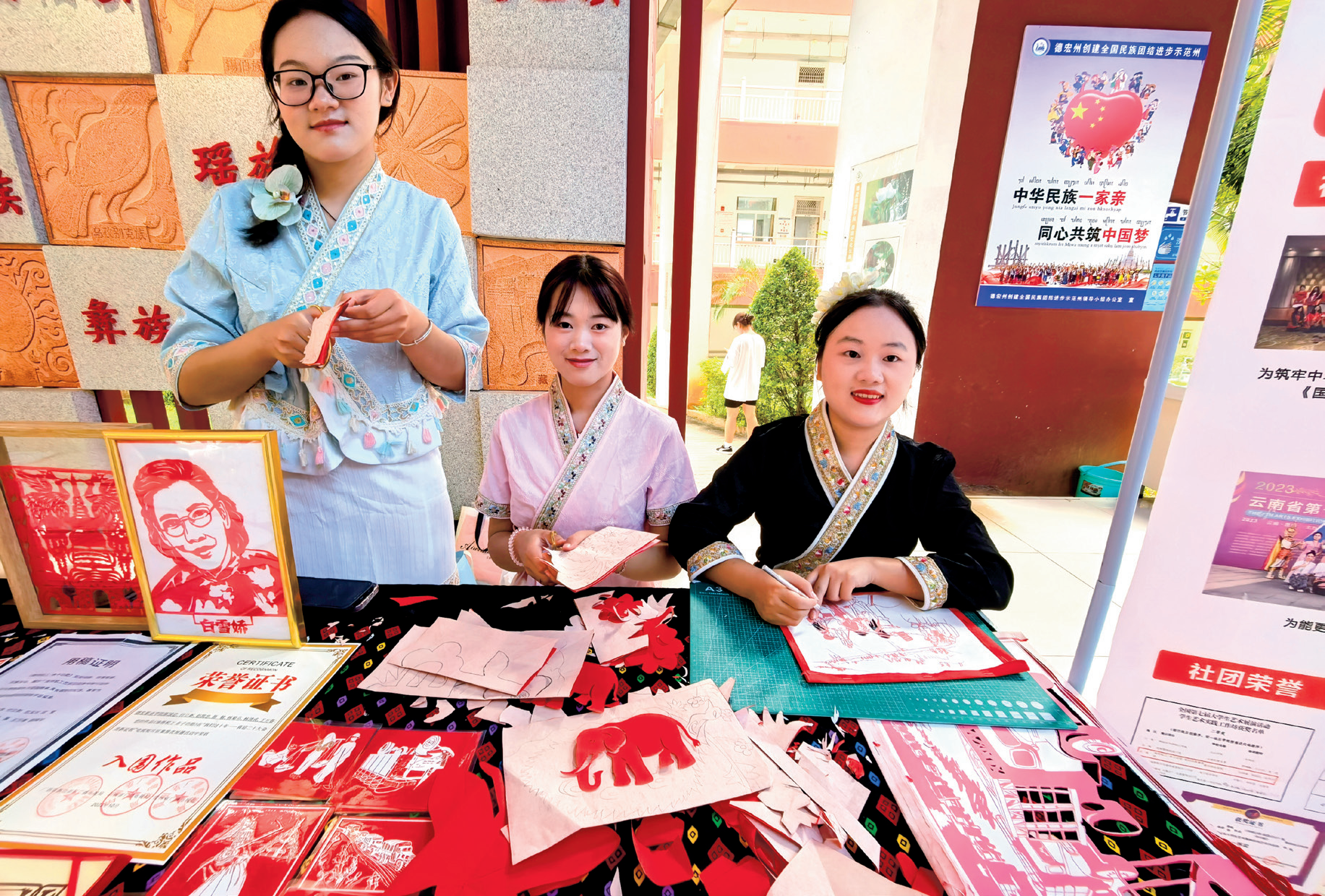 “第一次接触剪纸时,我内心充满好奇。”德宏职业学院学生王国欣分享道,“当剪刀在红纸上游走,我感受到的不仅是技艺传承,更是与中华文化的深度对话。特别是老师们创作的‘南侨机工’系列作品,通过传统艺术展现出了震撼人心的力量。”