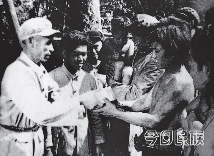 ▲为少数民族群众送上食盐(引自《不忘初心 牢记使命——云南省庆祝中国共产党成立100 周年成就展1921-2021》,云南人民出版社,2021 年)
