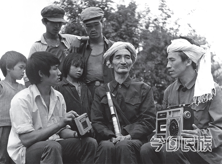 ▲潞西县(今芒市)芒海镇文化站工作人员在给民间老艺人录制民歌 杨小左摄于1986 年