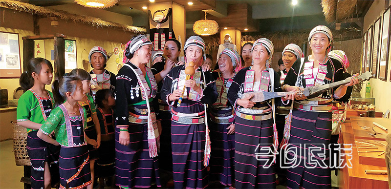 ▲临沧耿马大湾塘德昂族群众弹唱幸福生活