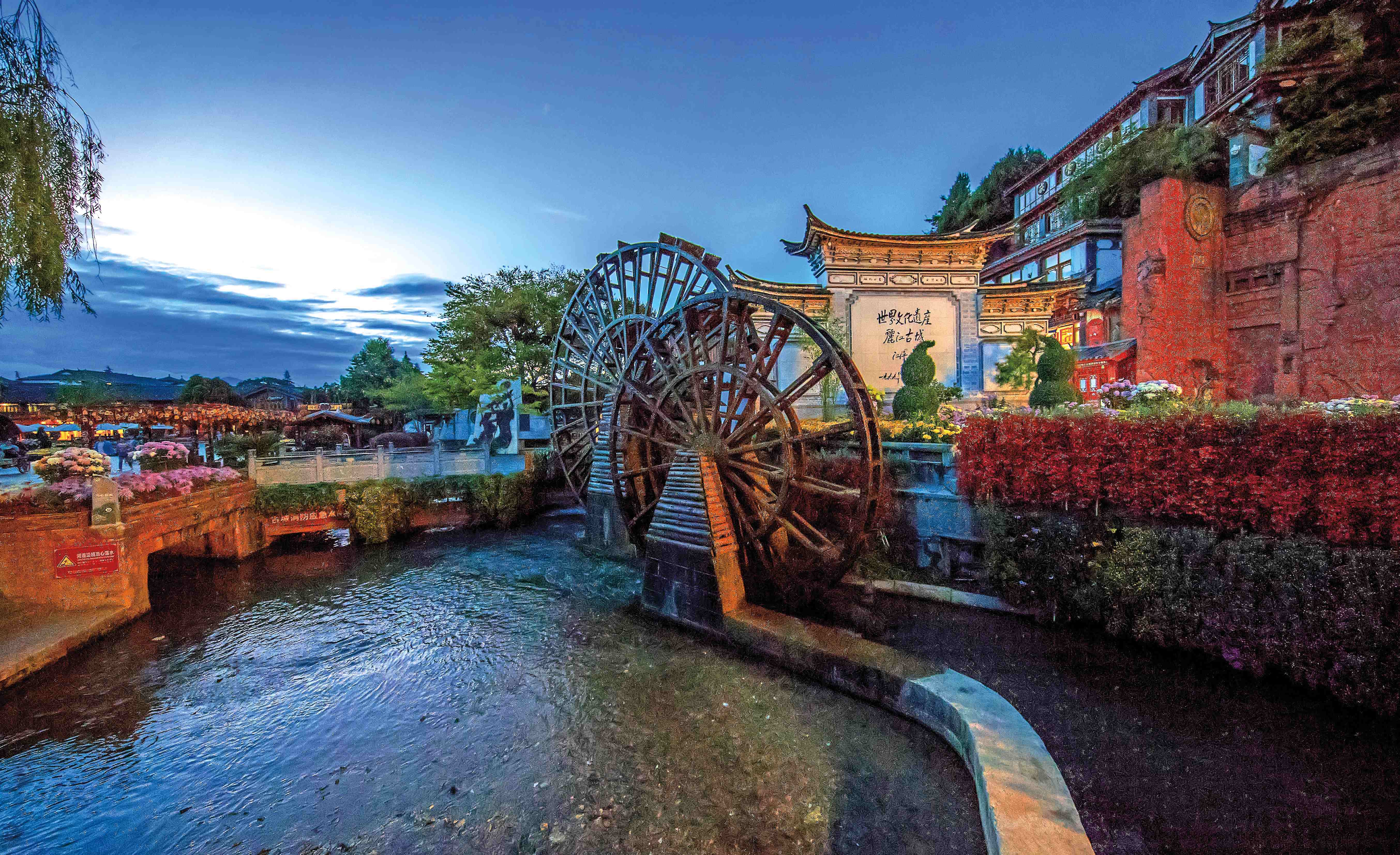 古城的每个街道中间都有一条青石砌成的河渠,纵横交错。山上的泉水汇聚到黑龙潭,再流到沿街的渠道,终年不断。在渠道落差大的地方,还建有多个人工瀑布。河渠不仅为古城居民提供了生活用水,也为这座高原之城带来了湿润和凉爽,增加了古城的灵动。渠道两边是碧绿的垂柳,柔细的枝条,随风起舞,使古城更加婀娜多姿。