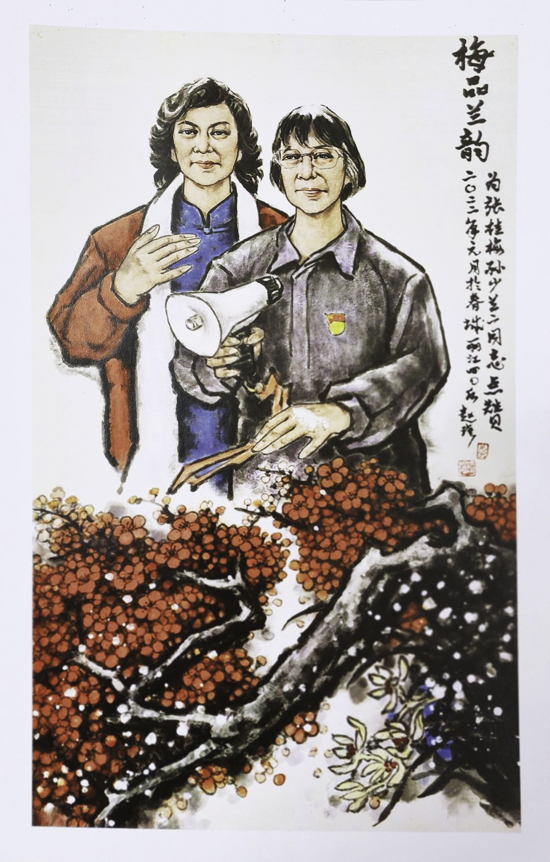 我的故乡,丽江华坪女子高级中学校长张桂梅的先进事迹,深深感动了全中国。作为丽江籍的纳西族画家,我很想为张桂梅同志画张画,因未找到立意点而一直没有动笔。2022年元月,偶然看到中央电视一台播放《故事里的中国——张桂梅》,看到了同在北京工作的乡亲孙少兰同志熟悉的面容。而经典歌剧《江姐》、江姐的第二代扮演者孙少兰,以及张桂梅的感人故事,使我茅塞顿开,在较短时间内,创作了《梅品兰韵——为张桂梅孙少兰二同志点赞》这幅画。