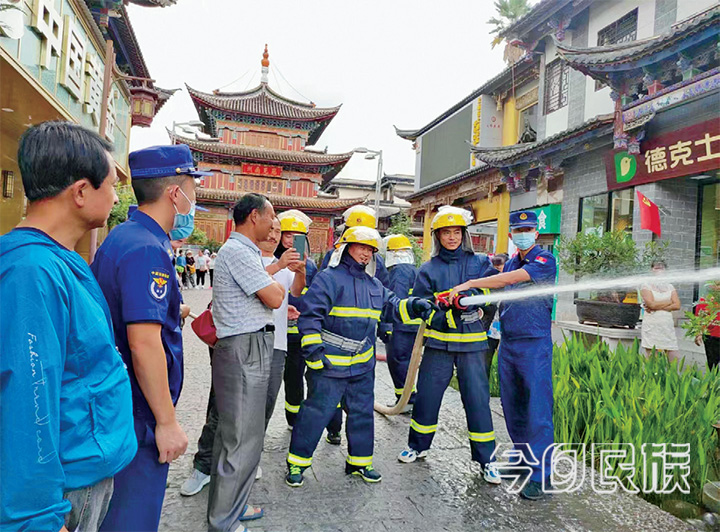 庆丰社区在消防员的指导下,对消防栓进行使用演练