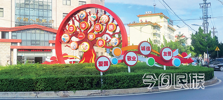 在通海县体育场环岛中心,一个以“中国梦”“中华民族一家亲”为主题的宣传景观小品竖立在花丛中,十分引人注目。每天,车流与行人在环岛附近来来往往,宣传景观小品的存在,使得中华民族共同体意识在“润物细无声中”植入各族群众心间。