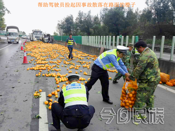 ▲ 帮助驾驶员捡起因事故散落在路面的橙子