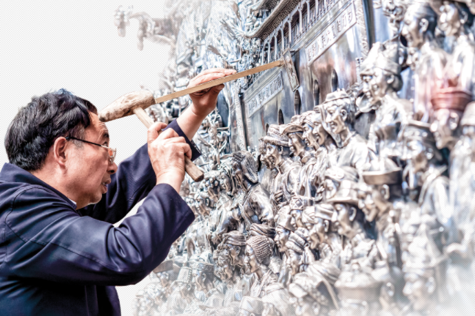 国家级非遗项目鹤庆银器锻制技艺代表性 传承人、中国工艺美术大师寸发标正在创 作《中华民族一家亲 同心共筑中国梦》大 型银雕屏风。 李国伟 摄