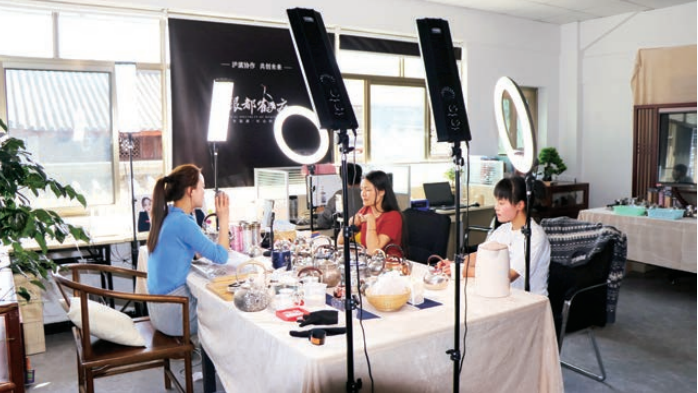 在银器小镇的云南鹤庆银器直播基地,三楼的直播间一字排开,每个直播间以鹤庆县的一个乡镇名来命名,货架上摆着各式银艺茶具产品。“云南鹤庆银器直播基地于2021年底建成,整合了月辉银器、一号银楼等100户生产厂家,形成品类齐全、库存充足的银器直播供应链,同时联合云南省珠宝检测机构、顺丰等物流企业,打造了集生产、直播销售、质检、物流为一体的银器直播供应链中心。通过构建‘直播+电商+网红带货’的新销售模式,将线上流量变现,推动电商系统化升级,拓展鹤庆银器销售渠道,推动银器产业创新发展,以产业兴旺带动乡村振兴。”鹤庆县电子商务公共服务中心、鹤庆银器直播基地负责人郭奔奔介绍道,“我们通过直播和短视频的方式,把鹤庆的银器推广出去,未来还将通过直播方式把鹤庆的农产品卖向全国。”