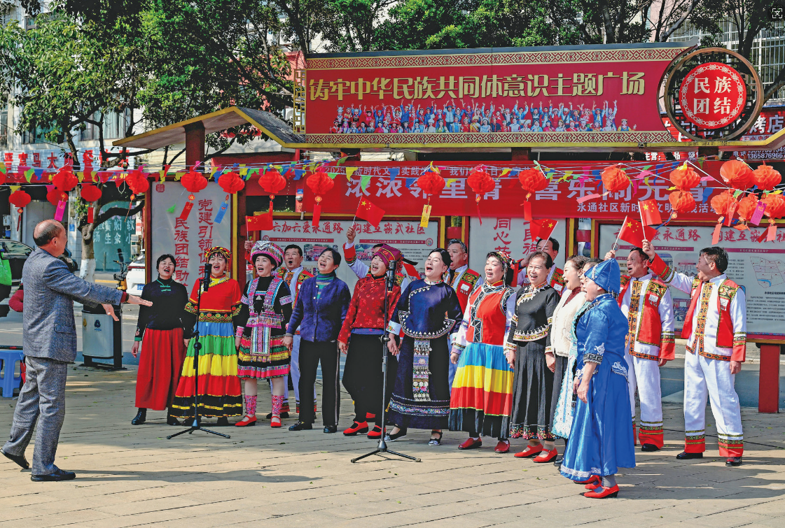 群众在主题广场唱民族团结歌 徐爱萍 摄