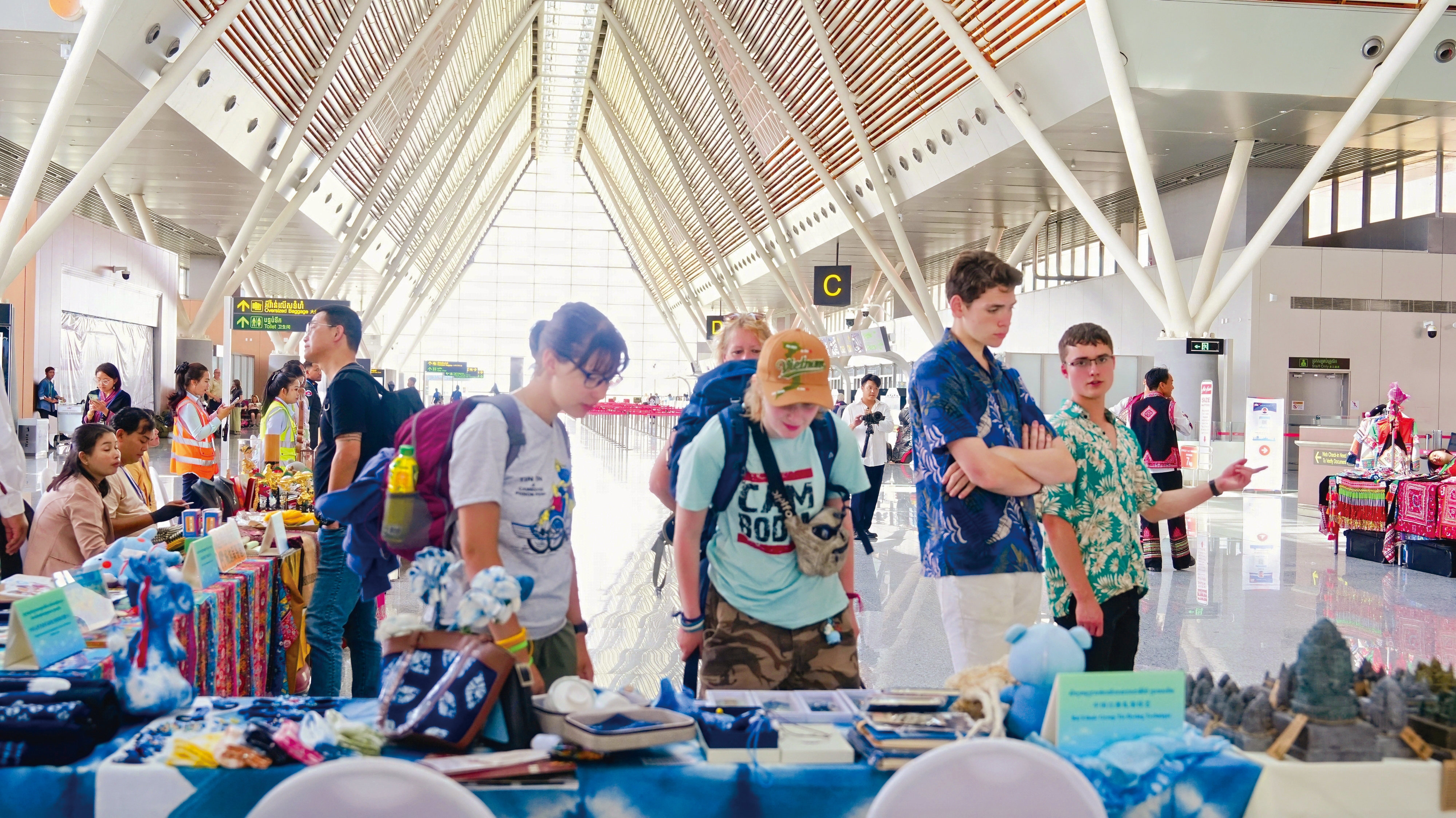 柬埔寨暹粒吴哥国际机场中柬文化走廊启用,外国游客参观大理扎染展台。云南省委宣传部供图