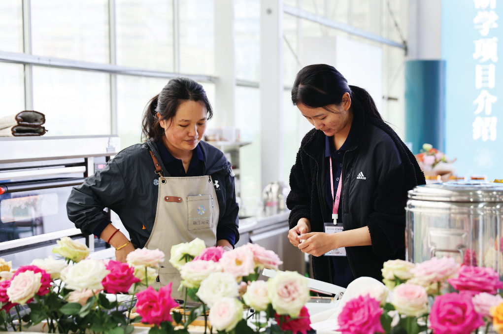 产业园内,员工们正熟练地对鲜花进行筛选、分级、包装。员工和月华笑着说:“现在在园区工作,一个月能有4000多元收入,多亏了花卉产业,让我们的生活越来越好。”通过土地流转、园区务工等方式,带动贵峰社区农村常住居民人均可支配收入从2019年的1.6万元增加到2024年的2.9万元。成立劳务服务公司向园区就近就地输送务工人员,园区日均吸纳附近村组务工人员300余人,年工资性收入近1400万元。