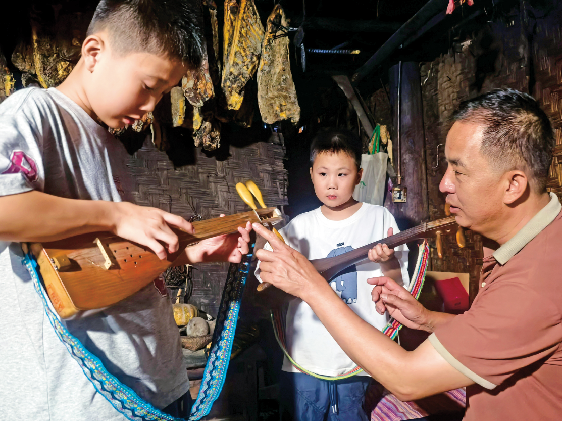 一声清脆的口弦“几味”响起,49岁的郁伍林弹起达比亚(怒族弹拨乐器),与其他传承人一起带着李雅舒、紫智浩两位9岁的孩子,唱起怒族民歌“哦得得”,曲调古朴空灵,“阿哥牧羊转山头”“竹木楼房的月光下”等意象起承转合于歌声中,余韵悠长……2025年7月,由文化和旅游部主办的2025年中国原生民歌节上,郁伍林和着节拍轻摇身体,看着眼前的怒族孩子,眼光柔和,笑容灿烂。