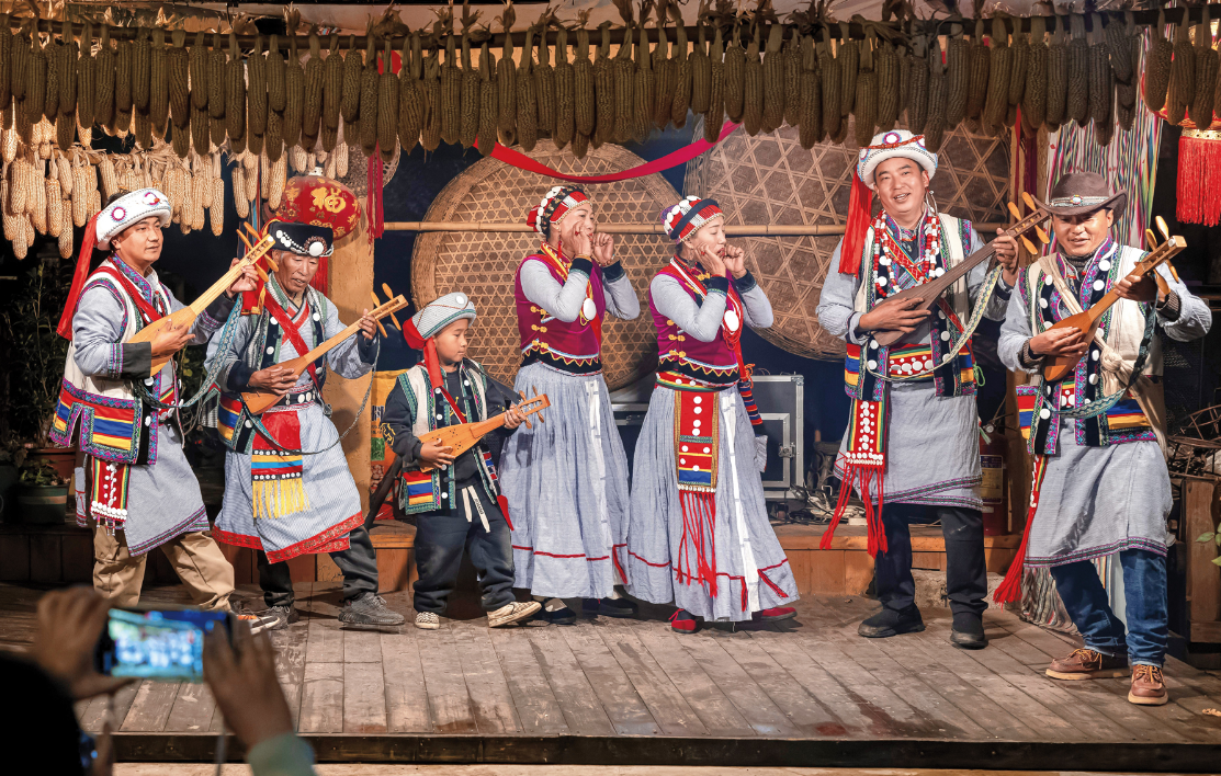 “我们怒族的火塘大多设在厨房或主屋正中间,是乡亲们日常生活中不可缺少的部分,不仅是生火做饭、烧火取暖的所在,也是主人待客和进行各种社交的重要场所,还是民间祈福祭祀的媒介。”接受本刊采访时,郁伍林娓娓道来:我们怒族的口弦,怒语统称“几味”,是女性传情达意的一种乐器,吹奏时能借音传话。2013年,口弦乐列入云南省第三批省级非遗代表性项目名录。而“达比亚”,又称“达表”“达变”,是怒族最古老的弹拨乐器,外形似琵琶、四弦,可弹奏出不同旋律的怒族传统音乐,其音色清脆、明亮,2023年,达比亚制作技艺列入第四批国家级非遗代表性项目名录。还有一种叫短笛,怒语为“独独哩”。笛身细而短小,五音调试,是傈僳族、怒族表达情感、社交往来的重要乐器。2005年,短笛吹奏被列入怒江州第一批州级非遗代表性项目名录。